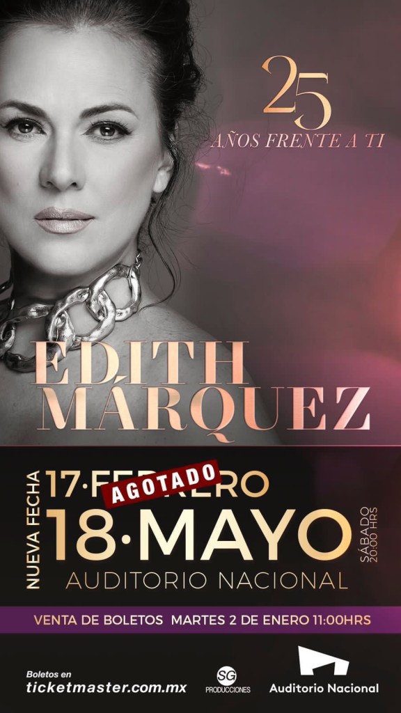 👉 ANUNCIA ¡NUEVA FECHA! 💥👊 18 de MAYO Siguiendo con su celebración por sus 25 años de su debut como solista, Edith Márquez arrancó este año 2024, anunciando que su esperado concierto del próximo 17 de febrero donde cantará todos sus éxitos en el Auditorio Nacional, se ha *¡AGOTADO!* por lo que ahora, además de agradecer a su público y seguidores, ya anunció una nueva fecha para este mismo año en el mismo recinto en el ‘Coloso de Reforma’ para el 18 de mayo.