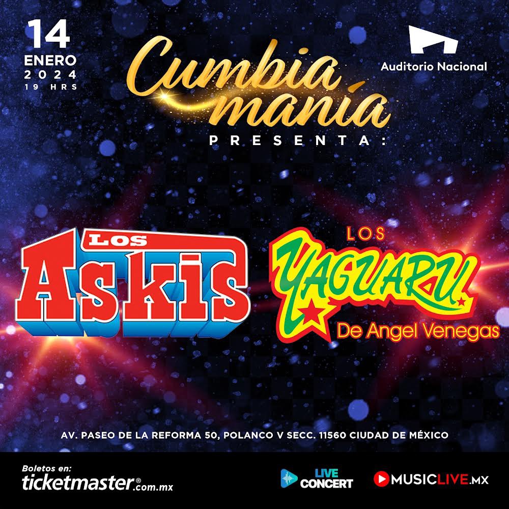 El próximo domingo 14 de enero de 2024, el Auditorio Nacional de la Ciudad de México vibrará al ritmo de la «Cumbiamanía», un esperado evento que promete convertirse en el epicentro de la fiesta y el ritmo de la cumbia. Dos de las agrupaciones más emblemáticas, Los Askis y Los Yaguarú, se unirán en un espectáculo sin precedentes para ofrecer a sus seguidores una experiencia inolvidable y repleta de energía. Boletos a la venta en el Sistema Ticketmaster y en taquillas del Auditorio Nacional.