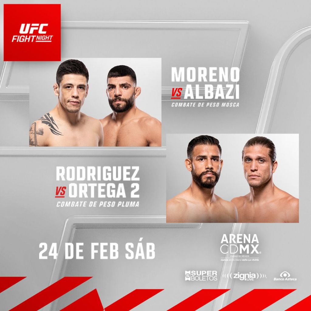 - El octágono regresa a la Arena CDMX el 24 de febrero con una cartelera que contará con algunos de los más grandes talentos de México, entre ellos el ex campeón de peso mosca Brandon Moreno y el ex campeón interino de peso pluma Yair Rodríguez