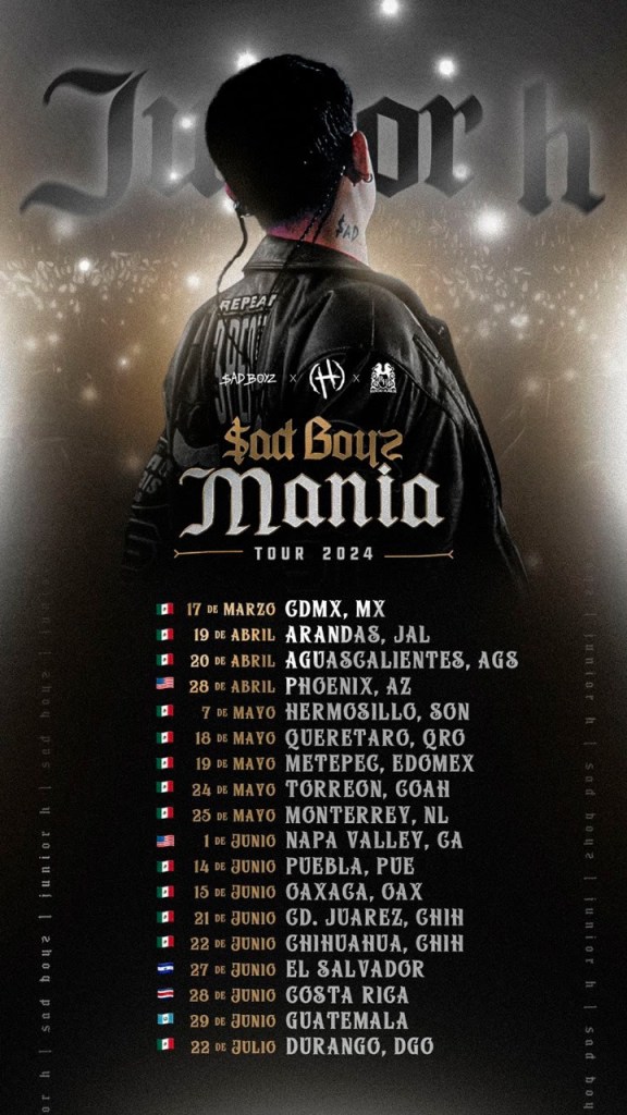 JUNIOR H, uno de los artistas con mayor visibilidad dentro del género de música mexicana urbana, comienza su gira de conciertos «$AD BOYZ MANÍA – TOUR 2024» por Norte y Centro América. Producida por RANCHO HUMILDE, la gira estará presente en dieciocho ciudades diferentes de México, Estados Unidos, El Salvador, Costa Rica y Guatemala.