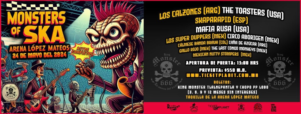 Con bombo y platillo, llegará Monsters Of Ska 2024 a la Arena Adolfo López Mateos el próximo viernes 24 de mayo. Los boletos se encuentran a la venta a través de TicketPlanet, en las taquillas de la arena, en la tienda Kings Monster de Tlalnepantla y el local de Pepe Lobo en el Tianguis Cultural del Chopo.