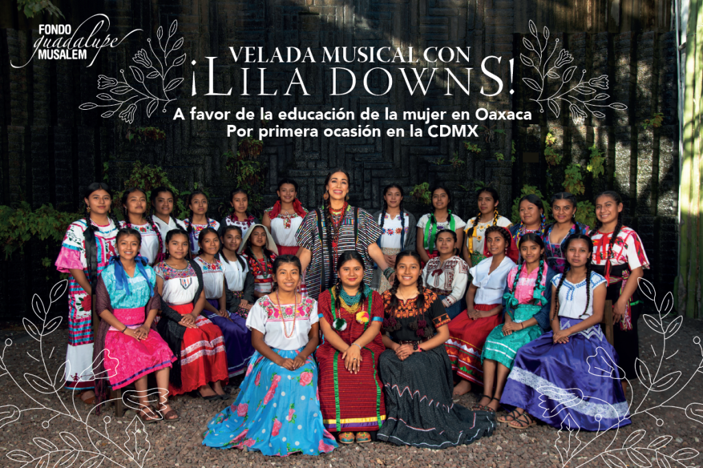 Desde hace 28 años el Fondo Guadalupe Musalem A.C. apoya la educación de mujeres indígenas afro mexicanas y de zonas rurales en el estado de Oaxaca. Cada año busca recaudar fondos para apoyar al menos a 50 jóvenes de nivel bachillerato y universitario, incluyendo el sostén de un albergue para las becarias que realizan estudios superiores en la ciudad de Oaxaca. Lila Downs es una de las integrantes principales de la Asamblea del Fondo Guadalipe Musalem y desde hace 20 años dona una noche mágica al brindar su voz y talento en agradecimiento a las personas donantes que generosamente dicen #SíALaEducaciónDeLasMujeres.