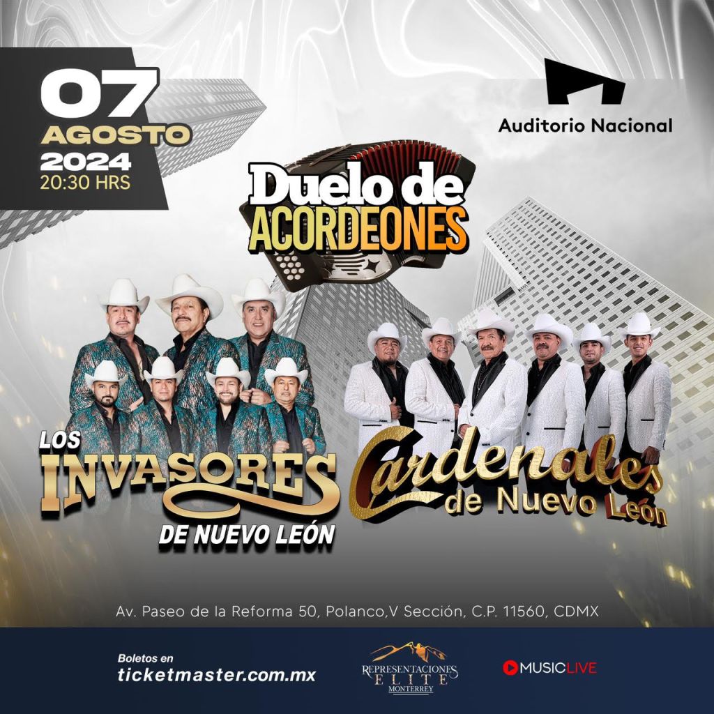 El Auditorio Nacional se engalanará con la presencia de dos de las agrupaciones más emblemáticas de la música norteña: Los Cardenales de Nuevo León y Los Invasores de Nuevo León. Como parte de su aclamada gira “Duelo de Acordeones”, que ha recorrido México y Estados Unidos, ambos grupos se presentarán el próximo miércoles 7 de agosto a las 20:30 horas, prometiendo una noche inolvidable llena de música y tradición. Boletos a la venta en el Sistema Ticketmaster y en taquillas del inmueble.