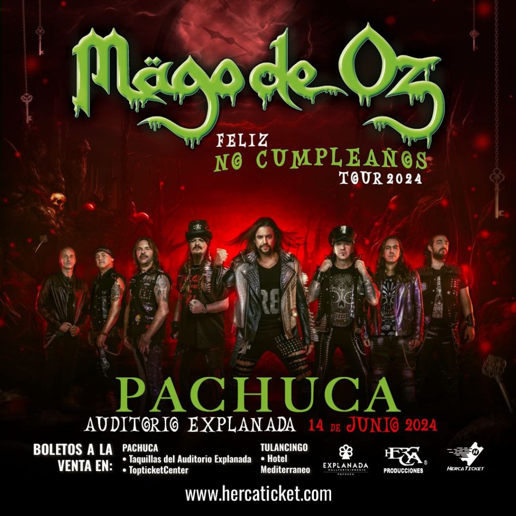 El Auditorio Explanada de Pachuca se engalana para recibir a la legendaria banda española Mägo de Oz, que con más de tres décadas de trayectoria, sigue encantando a las multitudes con su inconfundible fusión de folk metal y heavy metal. El próximo 14 de junio de 2024, como parte de su gira “Feliz no Cumpleaños Tour 2024”, Mägo de Oz promete una noche mágica llena de música, energía y nostalgia. Venta de boletos en Hertatickets en https://hercatickets.pagatusboletos.com/venta/es/entradas-musica-mago-de-oz
