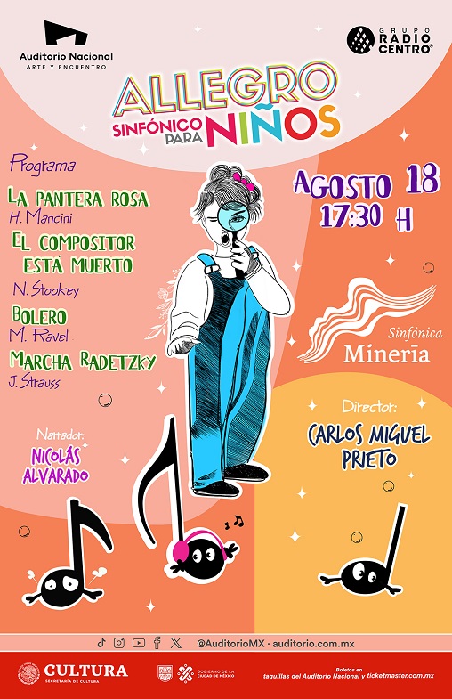Allegro Sinfónico para Niños, serie de conciertos creada por el Auditorio Nacional para llevar el poder de la música sinfónica al público infantil de forma divertida y dinámica, regresará el domingo 18 de agosto con un repertorio que despertará su espíritu detectivesco. Esta vez, los músicos de la Orquesta Sinfónica de Minería estarán bajo la batuta del maestro Carlos Miguel Prieto, director artístico de la agrupación. Nicolás Alvarado, escritor, comunicador y promotor cultural, participará como narrador y actor, convirtiéndose en el ingenioso detective que guiará el fantástico relato para resolver un gran enigma en El compositor está muerto de Nathaniel Stookey. También sonarán La Pantera Rosa de Henry Mancini, Bolero de Maurice Ravel y la Marcha Radetzky de Johann Strauss.