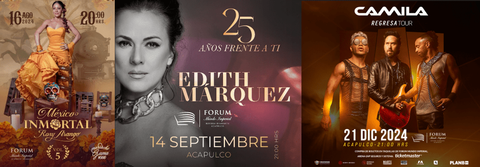 Recientemente se anunciaron los conciertos de Edith Márquez, Diego Torres, Natanael Cano y Camila, que se unen a los artistas de la cartelera de entretenimiento de Mundo Imperial, como lo son La Lucha Libre AAA, Rosy Arango, Luis Miguel, Gloria Trevi y Alejandro Fernández.