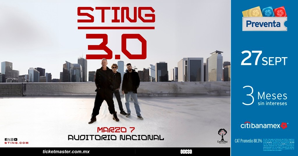 El artista ganador de 17 premios Grammy, STING, vuelve a sorprender con su gira mundial “STING 3.0”. Junto al virtuoso guitarrista y colaborador de muchos años, Dominic Miller, y el dinámico baterista Chris Maas (Mumford & Sons, Maggie Rogers), la banda interpretará los éxitos más electrizantes del repertorio de STING por toda Latinoamérica el próximo año, incluyendo la Ciudad de México el 7 de marzo de 2025 en el Auditorio Nacional.