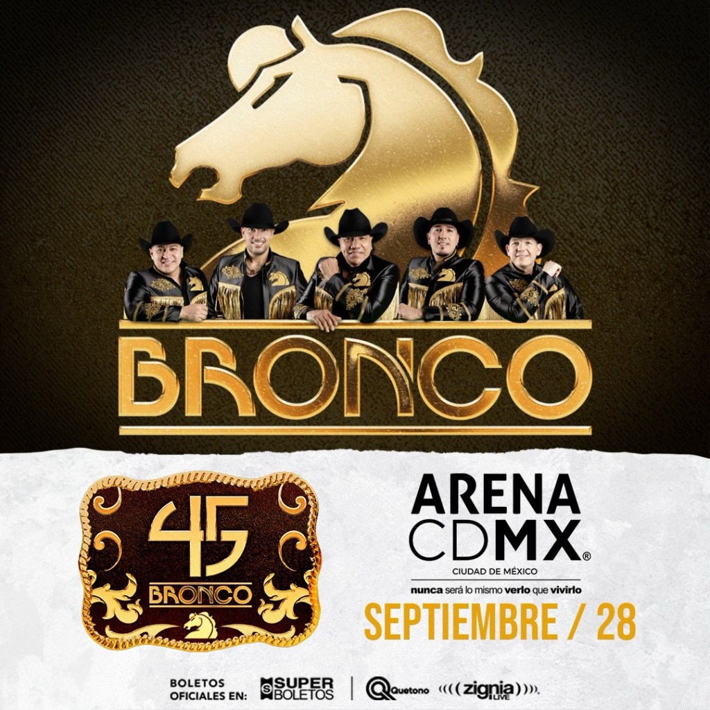 Más de 100 conciertos en México, Estados Unidos, Centro y Sudamérica ofrecerán Lupe, René, Adán, Javier y Arsenio este 2024 con su nueva gira internacional Bronco 45 La agrupación más emblemática del Regional Mexicano BRONCO prepara un espectáculo visual y musical que llevarán al público a vivir una experiencia sin igual Cuarenta y cinco años han pasado desde que el grupo se formó en Apodaca, Nuevo León, con algunos cambios en sus integrantes, manteniendo la imagen, voz y talento de Guadalupe Esparza, autor de los más grandes éxitos de BRONCO.