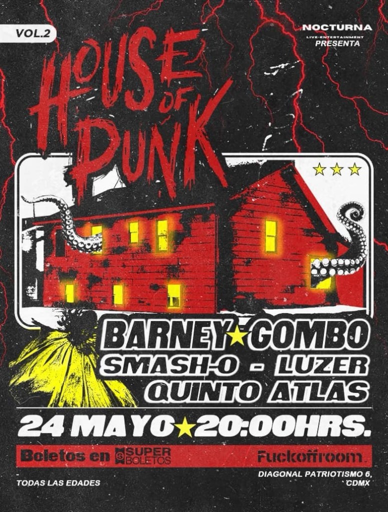 Todo está más que listo para que la noche del sábado 24 de mayo, cuatro destacadas bandas de la escena nacional del punk (Barney Gombo, Luzer,Quinto Atlas y SMASH-O) incendien, literalmente, las instalaciones del Fuck Off Room, con su música, propuesta y sobre todo con mucha actitud en lo que será el House Of Punk Vol. 2. Los boletos se encuentran a la venta a través del sistema Super Boletos.