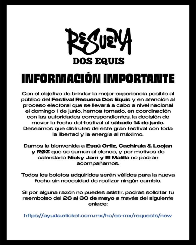 Los boletos adquiridos con anterioridad serán válidos para la nueva fecha en el mismo recinto. Para quienes no puedan asistir, deberán solicitar el reembolso del 26 al 30 de mayo en la página de Eticket.