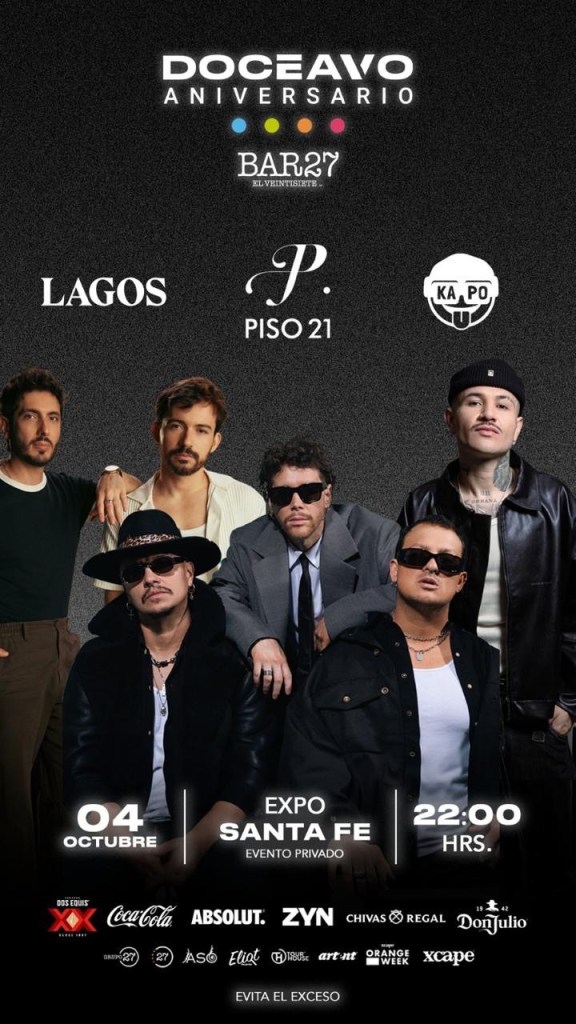 BAR27 cumple 12 años y lo celebra con un evento especial el próximo 4 de octubre en Expo Santa Fe, con un cartel espectacular digno de un festival, pero con la atención y formato de una experiencia VIP. Este año, los invitados serán Piso 21, Lagos, Kapo y algunas apariciones sorpresa que estamos ansiosos por descubrir.