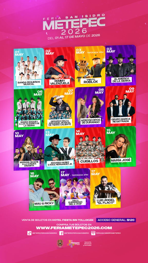 algunos de los artistas más importantes de la música en México.La cartelera del Palenque Metepec 2026 estará integrada por: