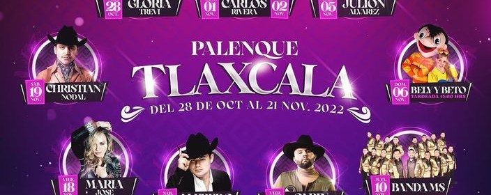 Este 28 de octubre de 2022 se darán inicio los Palenques en Tlaxcala, arrancando la noche con Gloria Trevi. Te esperamos hoy para que disfrutes de todas sus atracciones artísticas en el palenque, teatro del pueblo y otras amenidades para toda la familia. Sé parte de la fiesta tradicional más popular en el estado de Tlaxcala. La Feria de Tlaxcala